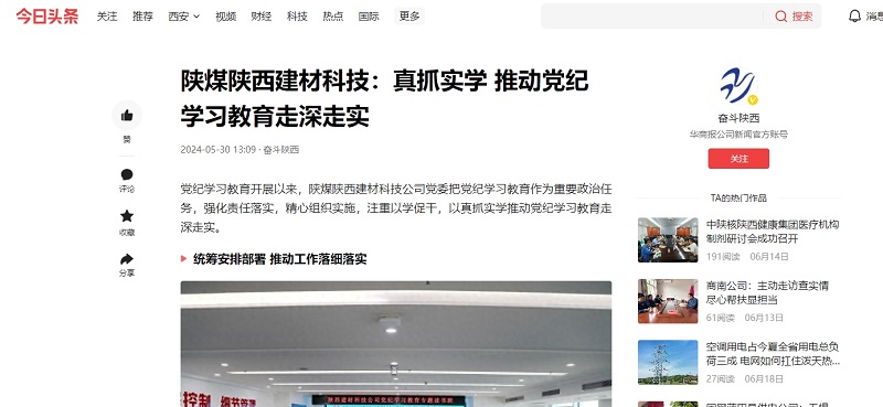 今日頭條、二三里 | 陜煤陜西建材科技:真抓實學 推動黨紀學習教育走深走實